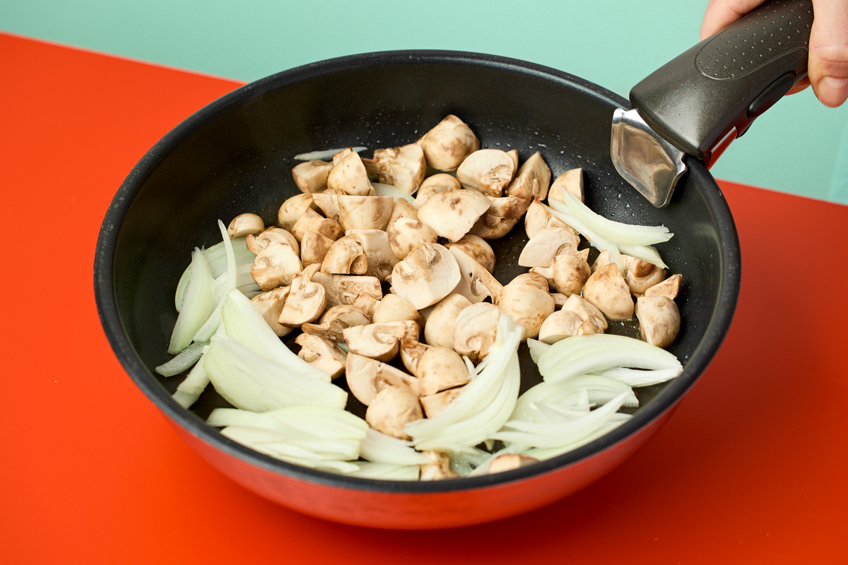 Для начинки: промойте и крупно нарежьте шампиньоны, лук очистите и нарежьте перьями. Обжаривайте на растительном масле грибы с луком в течении 3-5 минут на среднем огне, помешивая.
