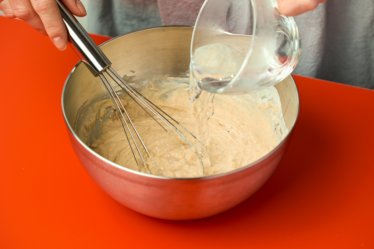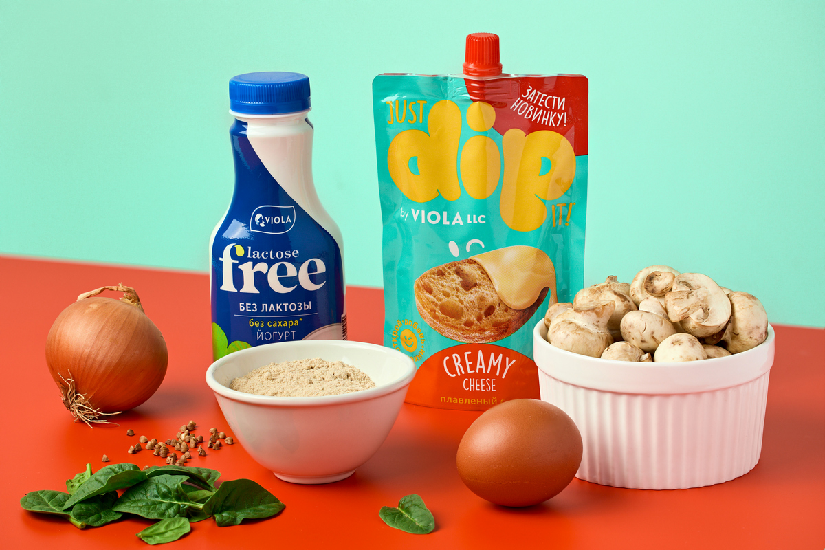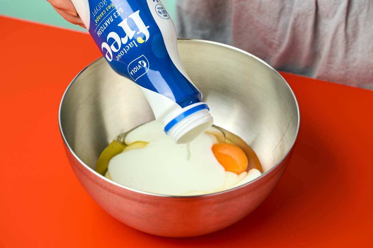Яйца смешайте с безлактозным йогуртом Viola Free и 1/2 ч.л. соли. Добавьте смесь гречневой и пшеничной муки, щепотку соды. Перемешайте до однородности.