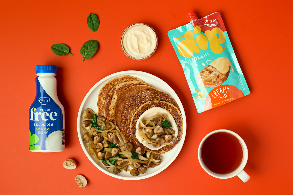 Блинчик смажьте сырным дипом Viola, сверху выложите немного начинки и слегка сверните пополам. Приятного аппетита!