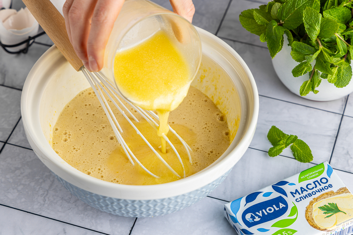 Муку смешайте с разрыхлителем и просейте к жидким ингредиентам, замесите однородное тягучее тесто.