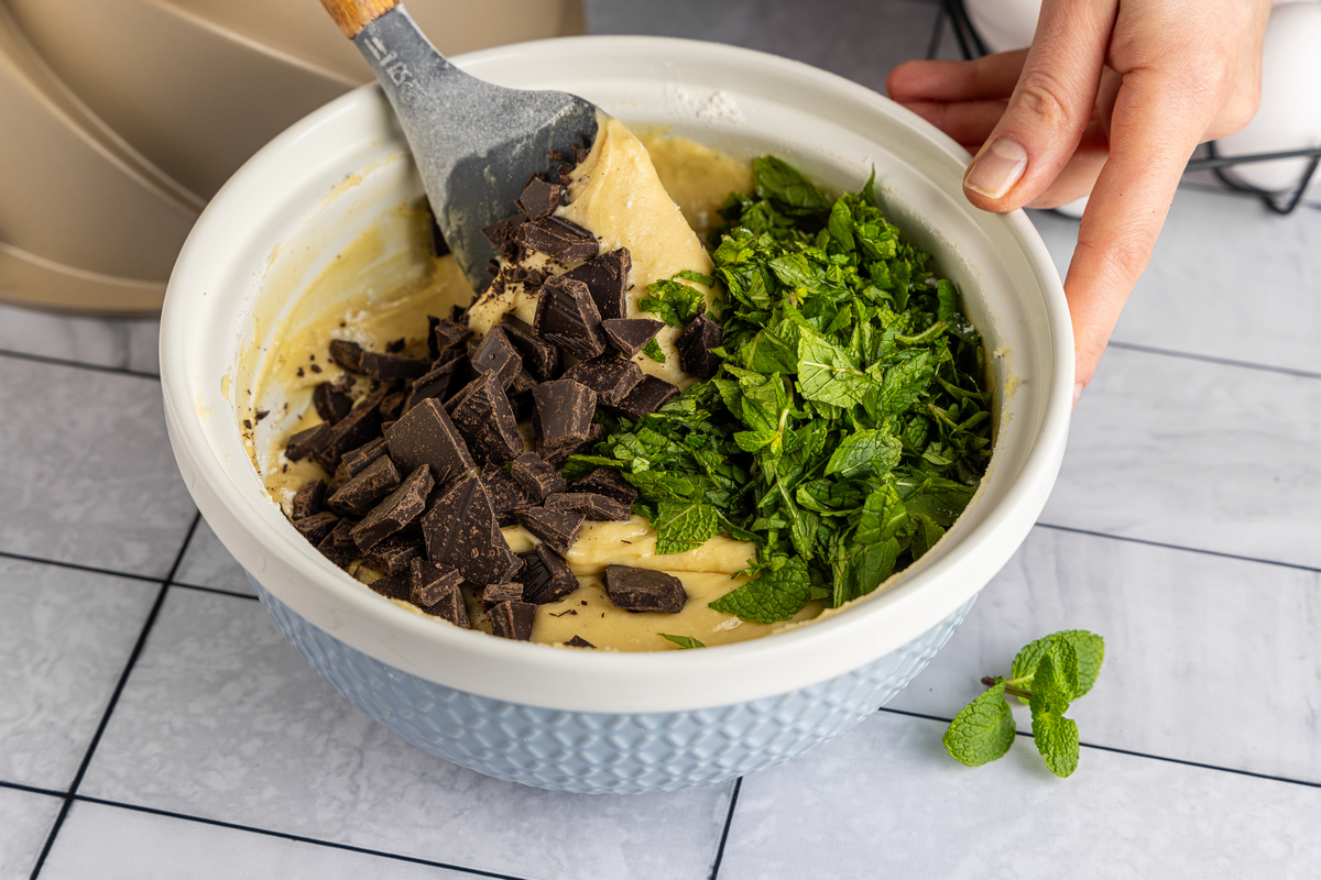Шоколад поломайте или порубите на мелкие кусочки, листики мяты оборвите с веточек и нарубите. Добавьте в тесто шоколад и мяту и хорошо перемешайте.