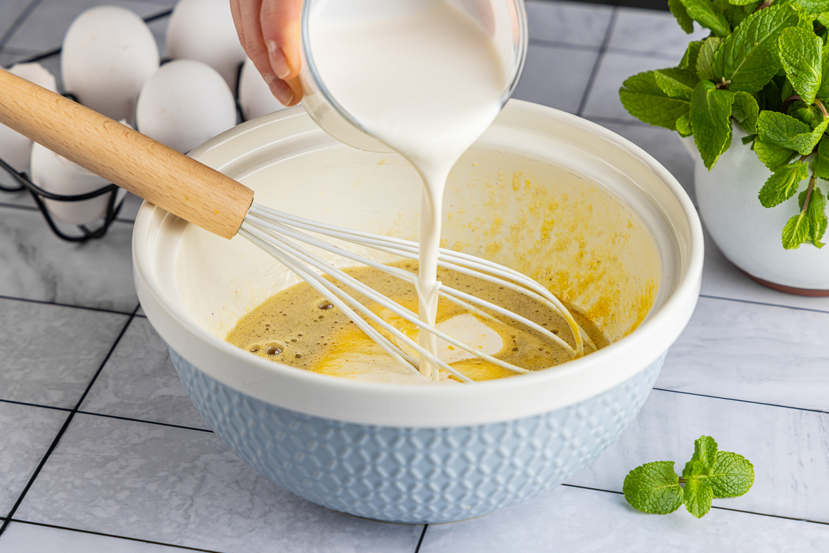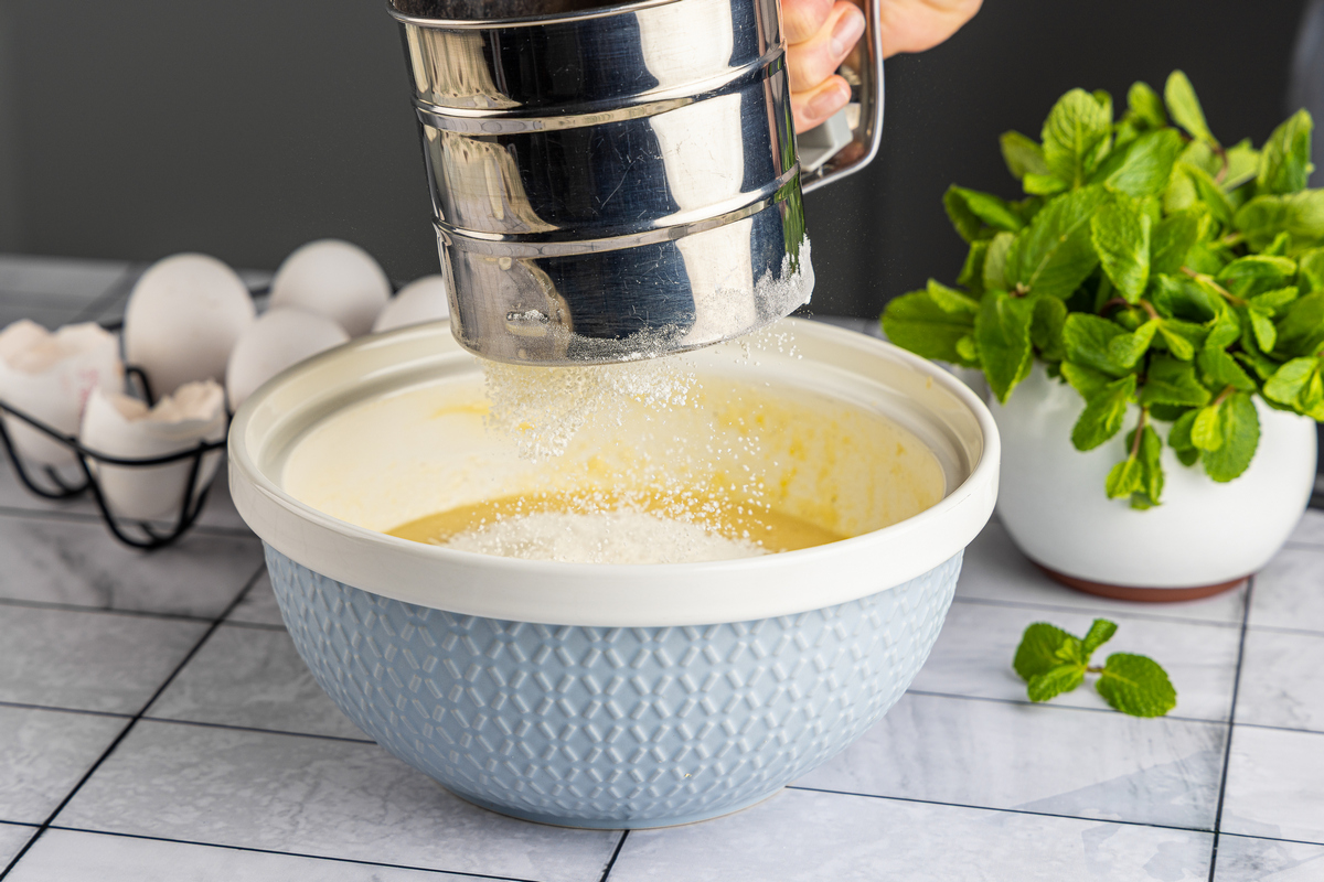 Муку смешайте с разрыхлителем и просейте к жидким ингредиентам, замесите однородное тягучее тесто.