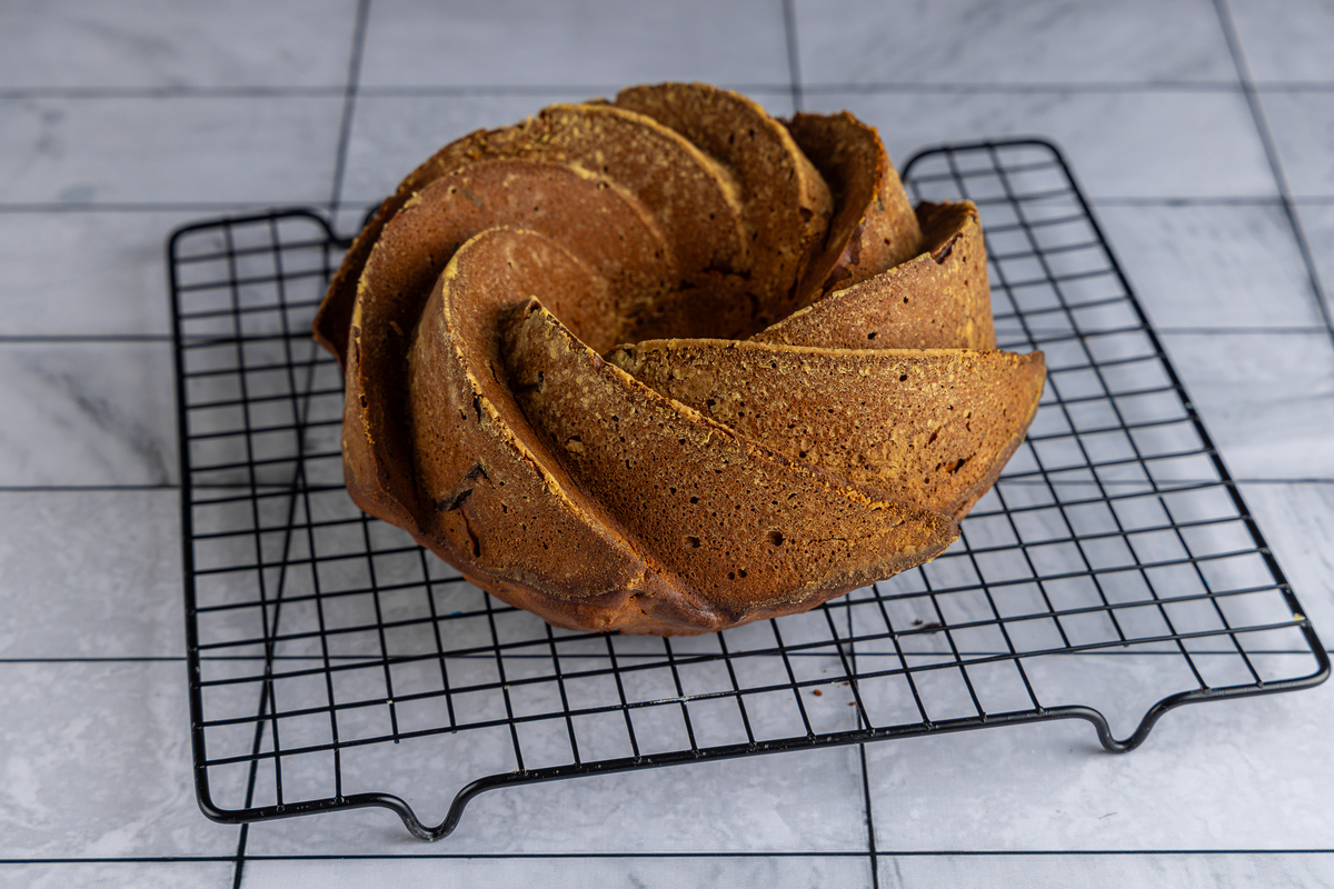 Готовому пирогу дайте остыть, полейте глазурью, для которой сгущенку смешайте с сахарной пудрой.